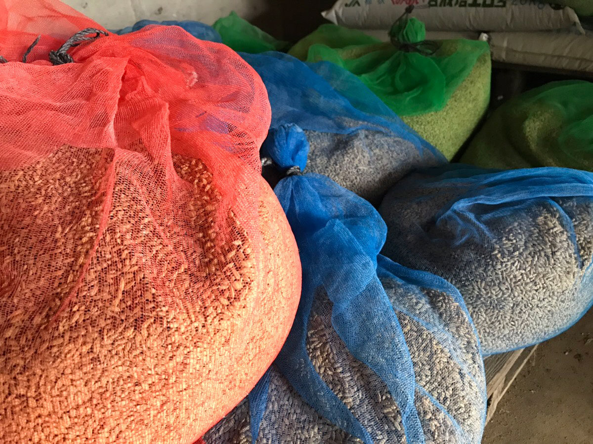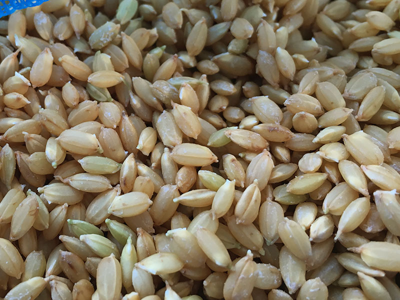 写真は芽だしをした種です。25℃の水に24時間くらい入れて、この状態です。少し芽が出てきてるのが分かります。白っぽいのがついていますが、これは殺菌してくれる菌の粉です。菌で菌を殺すっていう方法です。24時間つけた後で古い洗濯機で脱水して乾かします。じゃないと乾くのに時間と手間がかかるので、数年前からそうしてます。