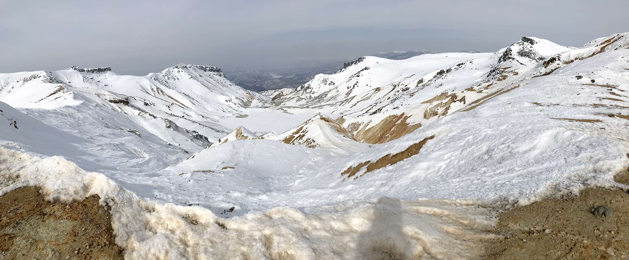 上の写真は途中にある沼ノ平っていう噴火した後っぽいところです。この景色が見たくていったんですが、ここはすごくテンション上がりました。なぜかここは異様に風が強くてスノボを担いでると風をうけて転びそうになるくらいでした。雪がない時期にまた来たいです。
